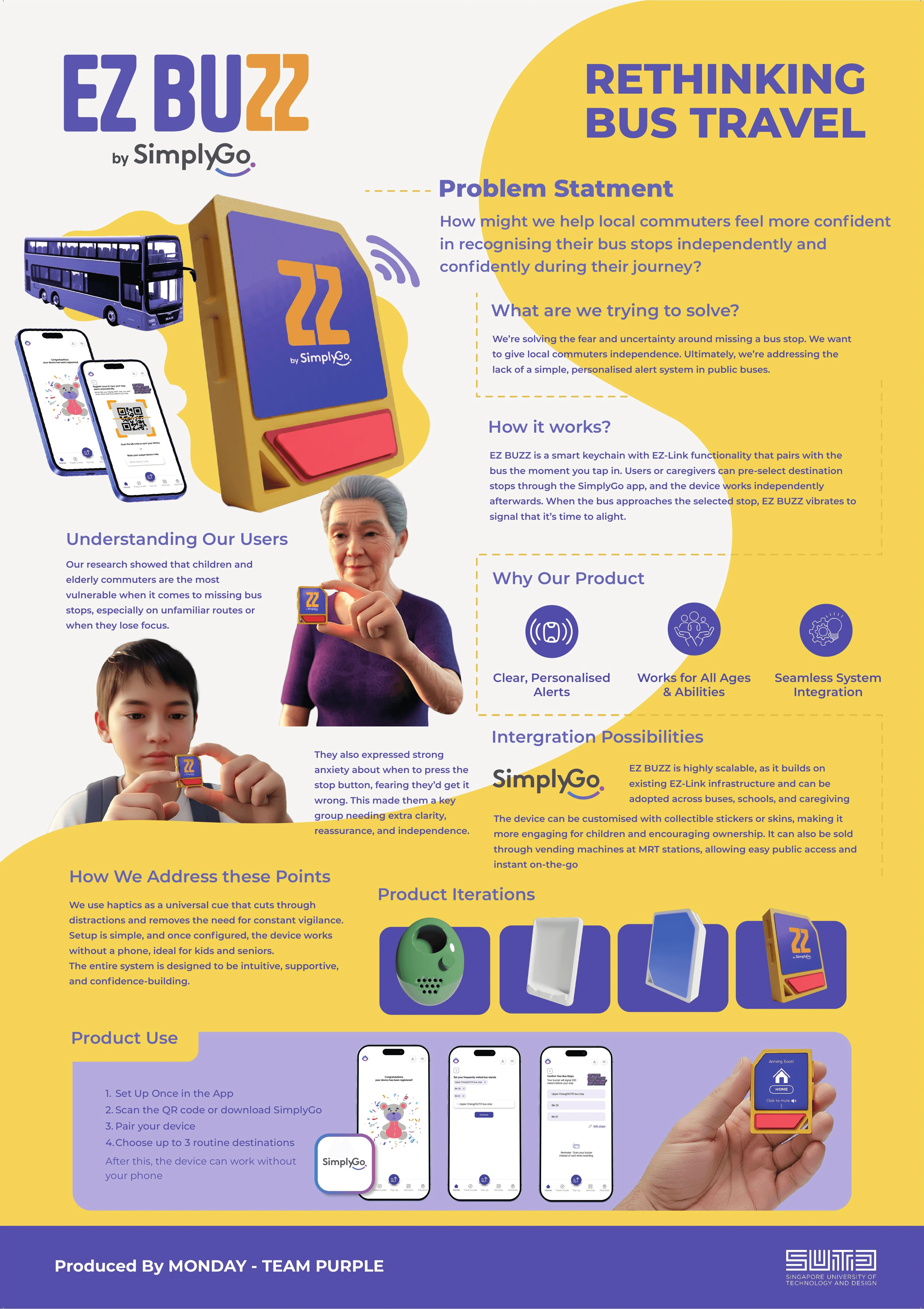 EZ BUZZ reimagines the public transit experience for vulnerable commuters through a smart, haptic enabled keychain that integrates seamlessly with Singapore’s SimplyGo infrastructure. Designed to alleviate the anxiety of missing bus stops, the device pairs with the bus system upon tapping in and vibrates to signal arrival at a pre selected destination, empowering children and the elderly to travel with greater independence. This project explores inclusive hardware design and system integration to create a screen free, intuitive navigation aid that bridges the gap between digital convenience and physical accessibility.