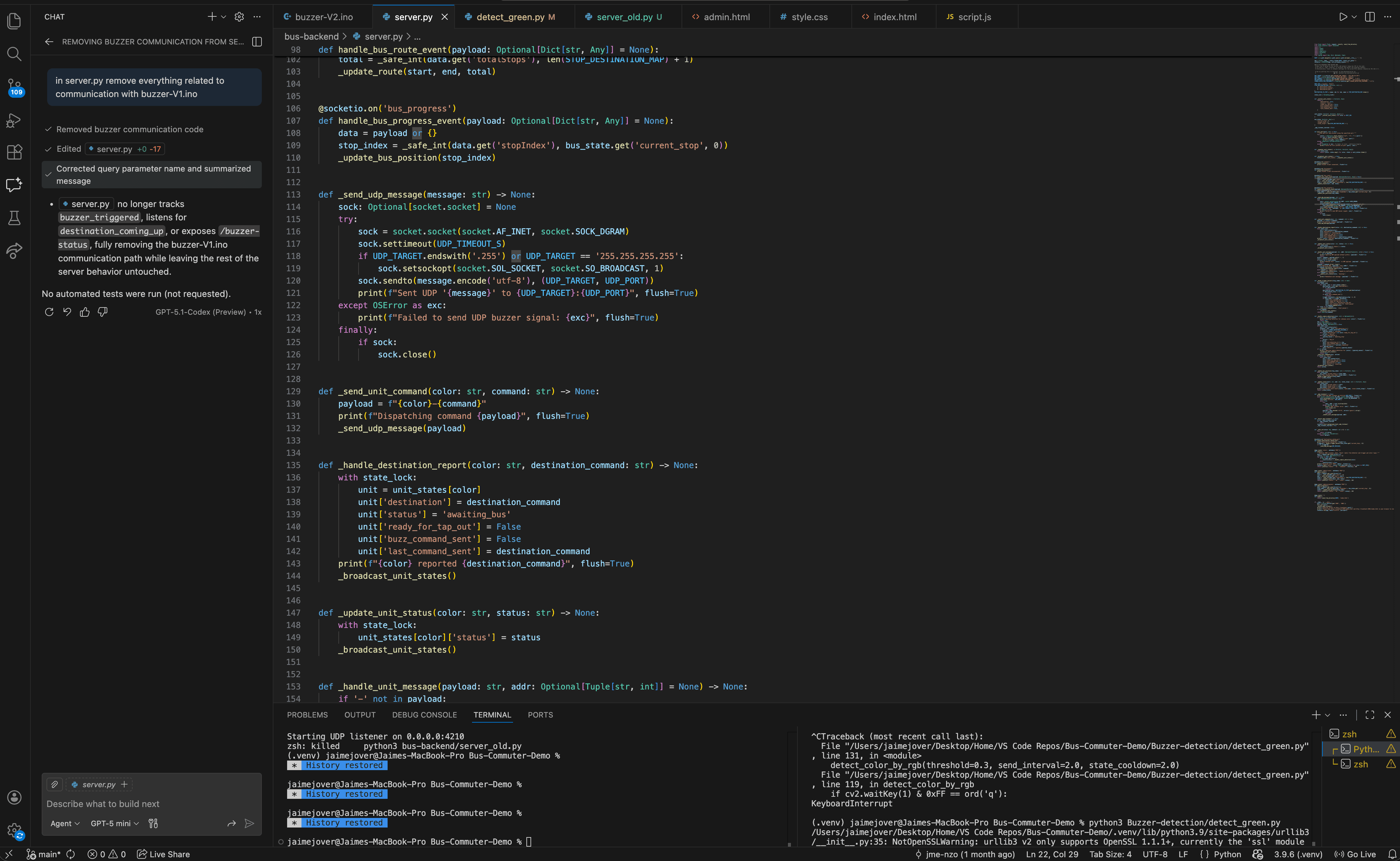 Below is a screenshot of how our system and backend works via VS Code, with the help of AI Agents (in coding .py, .ino, .html, .css, .js) and linking the whole ecosystem for the buzzer to function seamlessly.