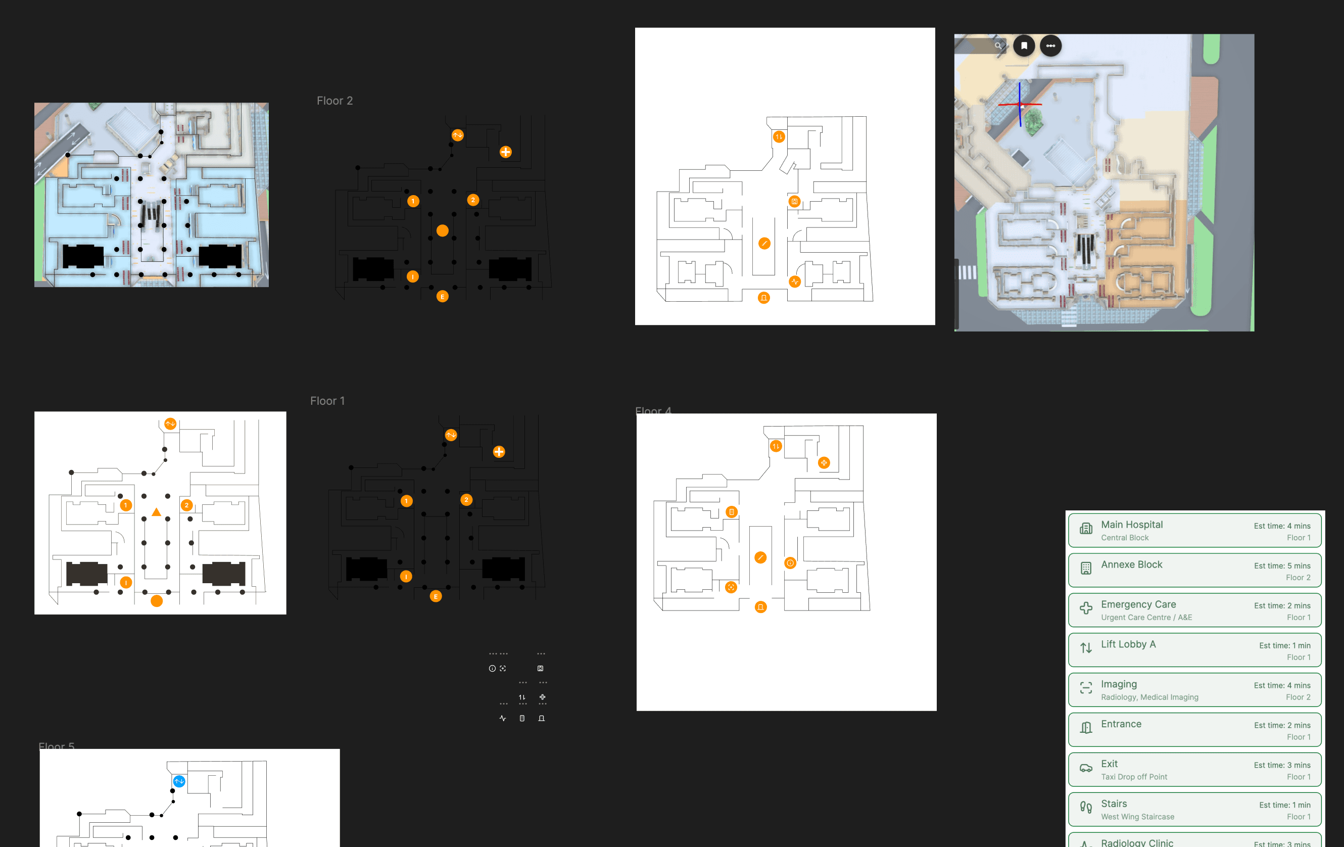 Modeled an accurate 3D replica of a hospital floor via Figma, translating physical architectural constraints into a digital interactive map.