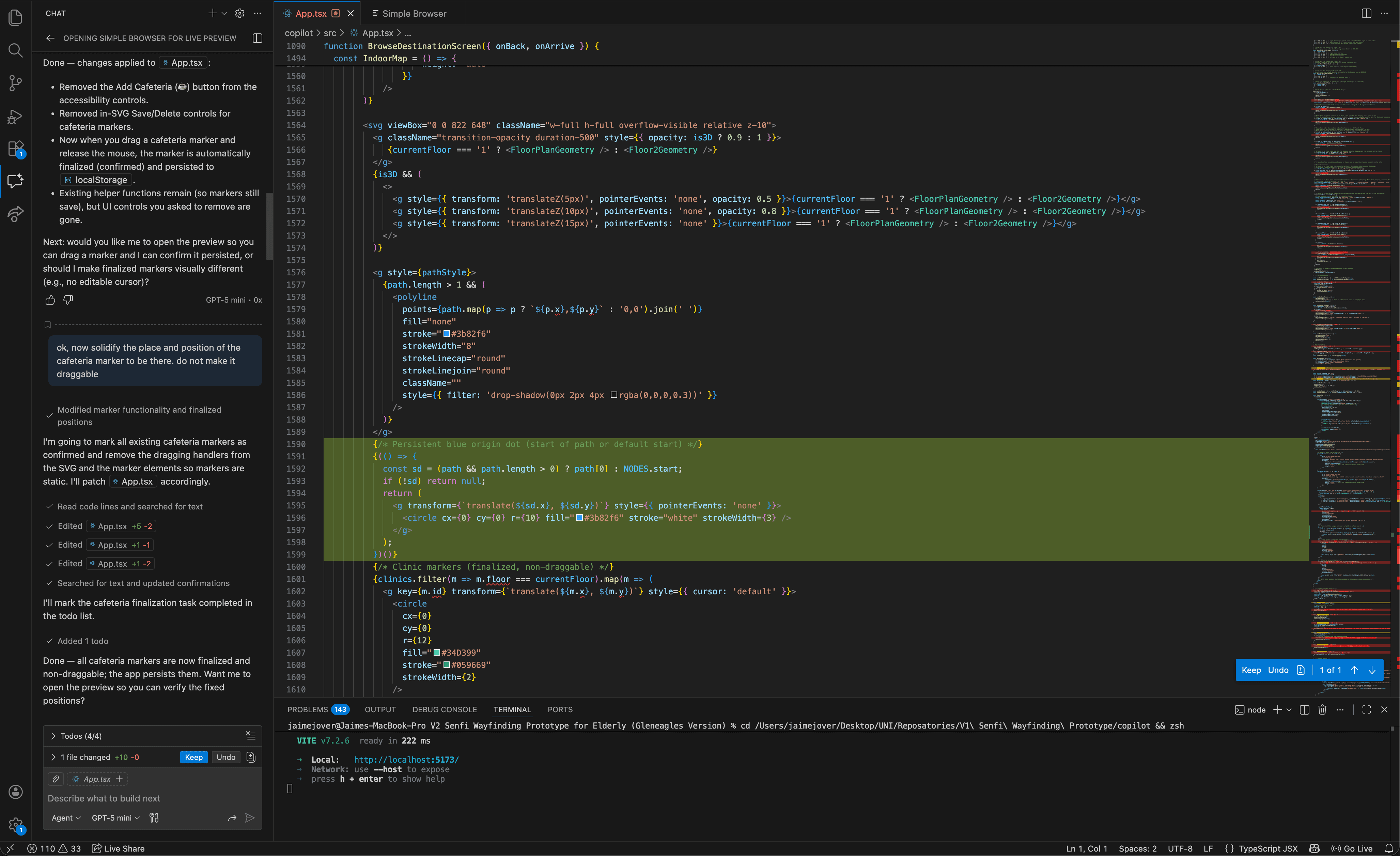The challenge was rendering a heavy 3D Digital Twin in a mobile browser without lag. I utilized React.js for its component modularity, but the real breakthrough was my use of VS Code with AI-assisted workflows (Gemini 3.0 /Claude Opus 4.5). This allowed me to rapidly prototype complex Dijkstra or A star algorithms (for the routing logic) in days rather than weeks, proving that high fidelity 3D navigation could run smoothly on a patient's average smartphone.