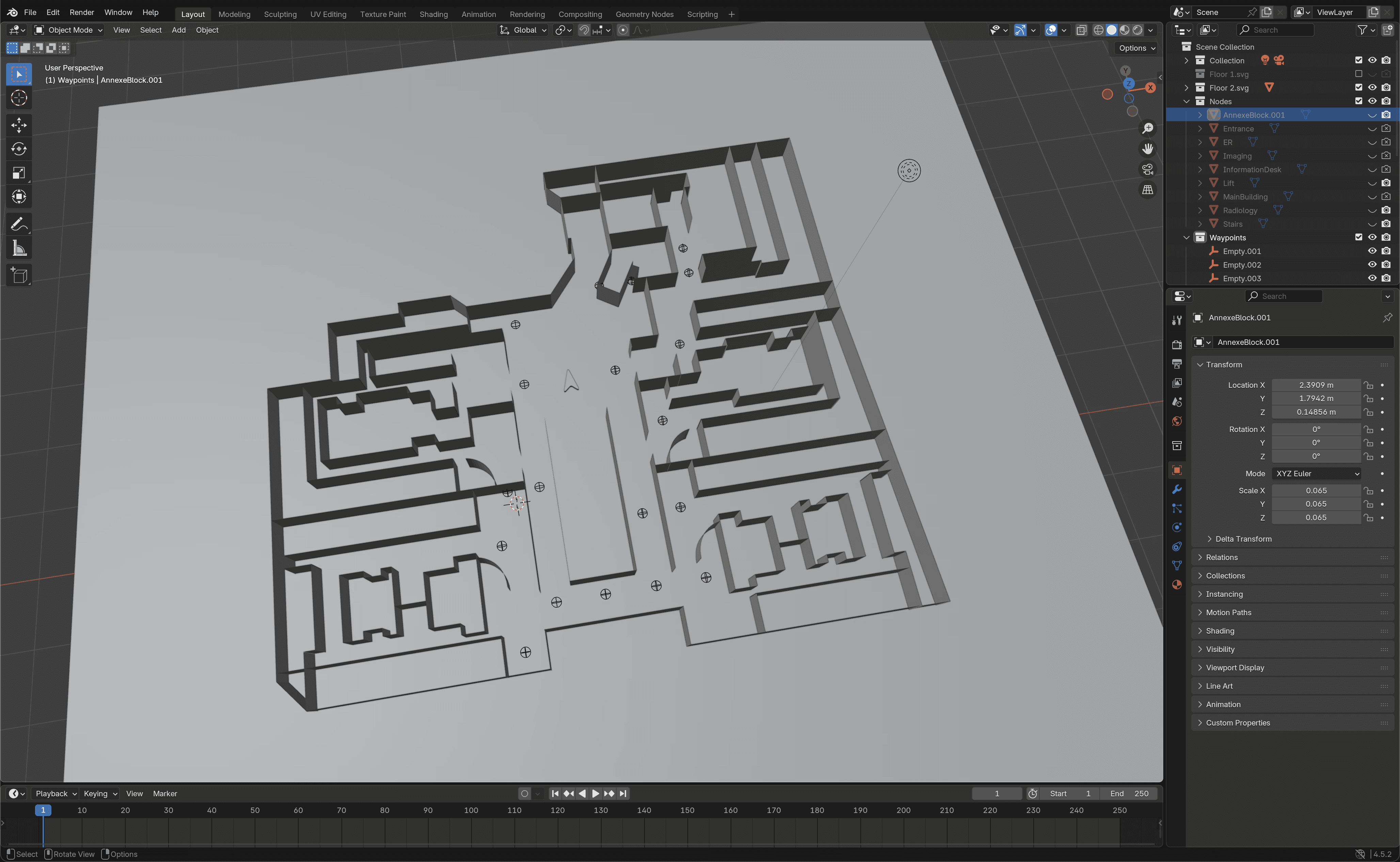 Developed a node based routing system in Blender and exported as .glb into a React.js. Rather than simple A to B lines, the logic accounts for user constraints dynamically re routing paths based on the user's mobility / profile position.
