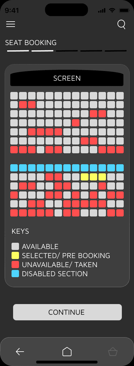Having Last minute booking seating sections as well as disabled sections only for the cinema seating bookings. Having these option on the screen with keys, accommodate inclusivity and a wider audience to benefit when using the App.